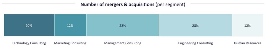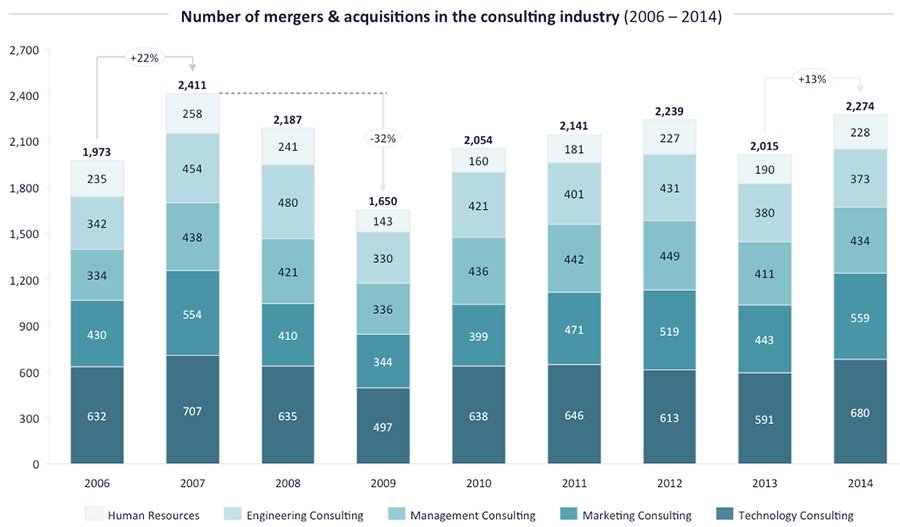 More than 2,000 mergers and acquisitions occur annually in the consulting sector. IT consultants play a key role, dominating with 30% of deals. Reasons for such transaction often include markets, consolidation, service portfolios, and emergent technology such as cloud computing, cybersecurity, and IoT.
