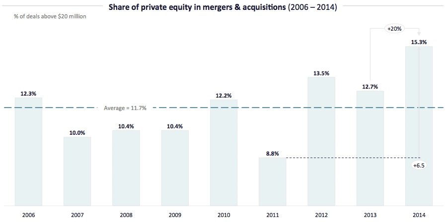 In 2022, private equity firms lifted their visibility in mergers and acquisitions, accounting for 15% of deals above $20 million and indicate a continuous shift towards more strategic financial partnerships.